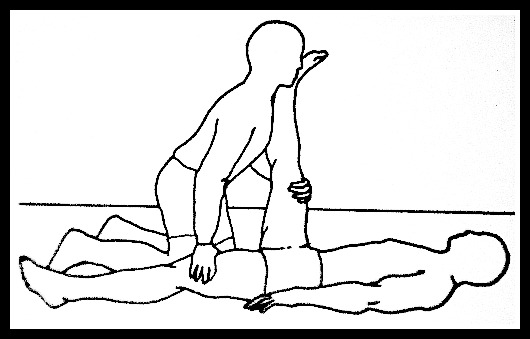 * Sit down on the floor with your legs extended in front of you while your partner stands behind your back with one hand on your upper back and the other hand on your lower back.