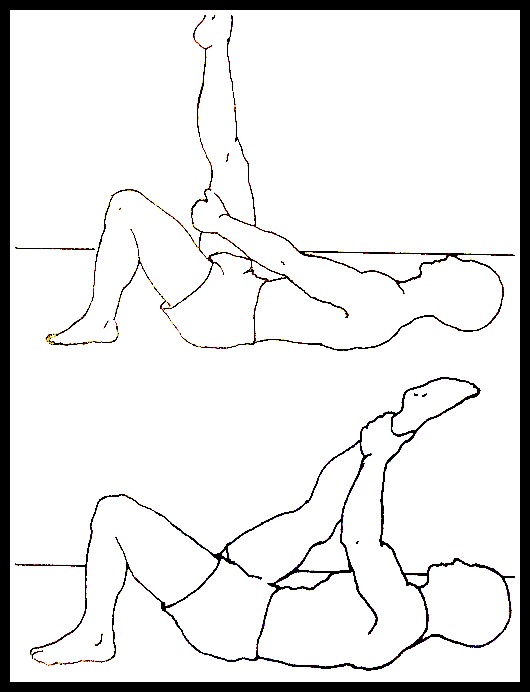 * Extend one leg upward and slowly pull it towards you holding it for 8 seconds.