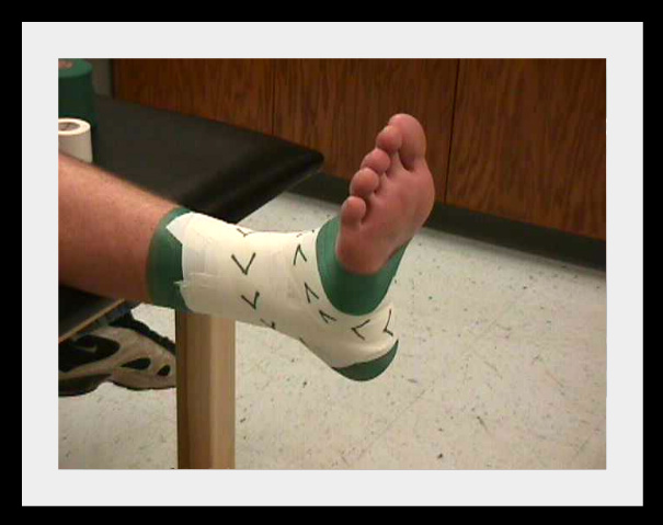 Finish the tape job by applying a closing strip same as an anchor but at the bottom of the foot. Than apply two more anchors at the top of the tape job to secure the tape fully.